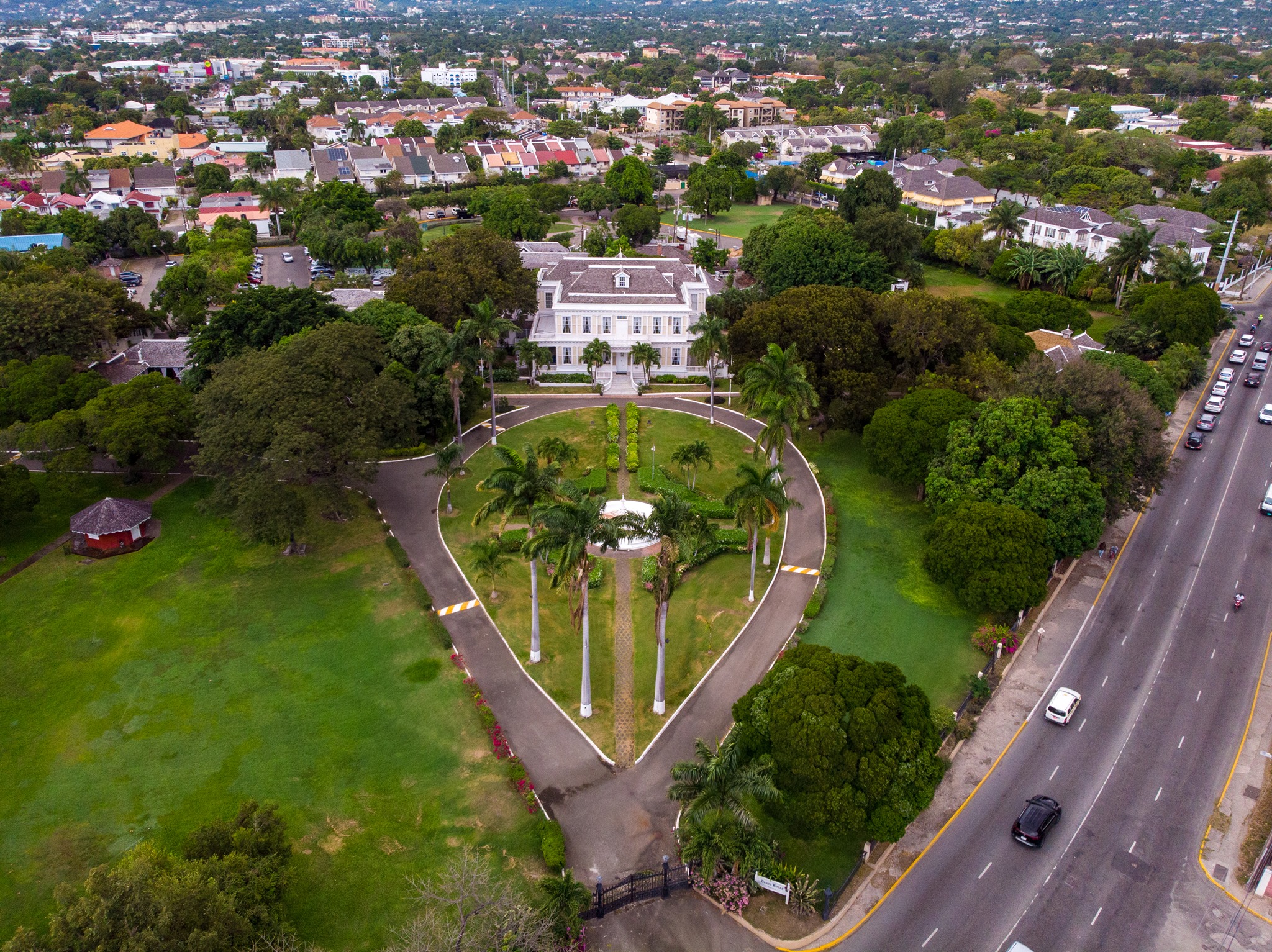 The mansion encapsulates a sublime fusion of Caribbean and Georgian architecture. It is adorned with a carefully curated collection of Jamaican, English, and French antique pieces and reproductions. The mansion’s impressive facade overlooks vast expanses of manicured, lush green lawns, further enhancing its grandeur.