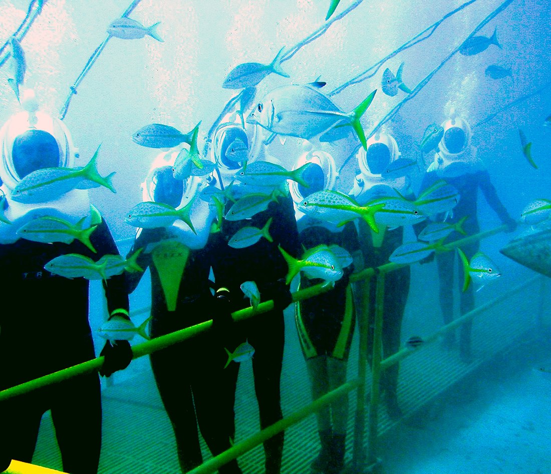 The entire Sea Trek underwater walking tour is conducted in less than an hour, including the pre-dive presentation, water entry, underwater exploration, and debriefing.